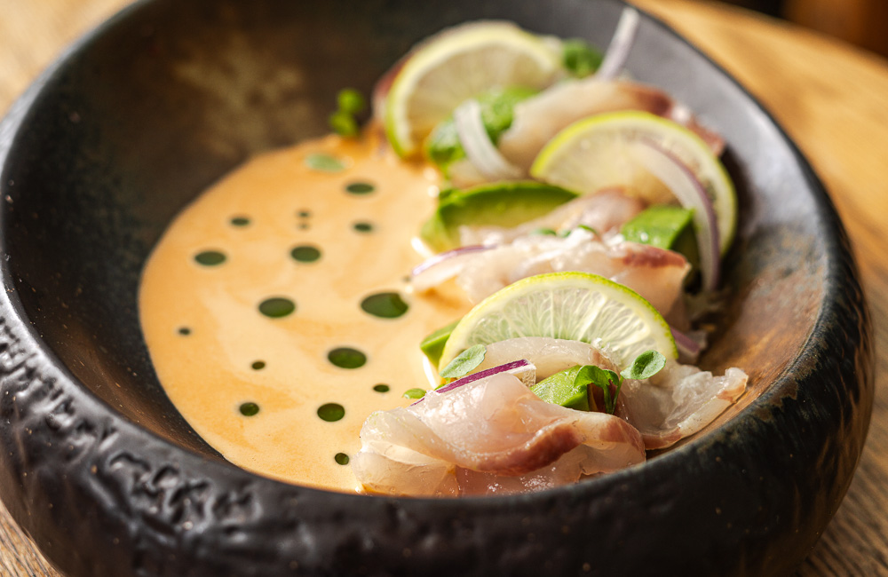 tiradito de pescado blanco con leche de tigre y piure, donde el mar se expresa en profundidad y umami. El cuarto tiempo presentó un