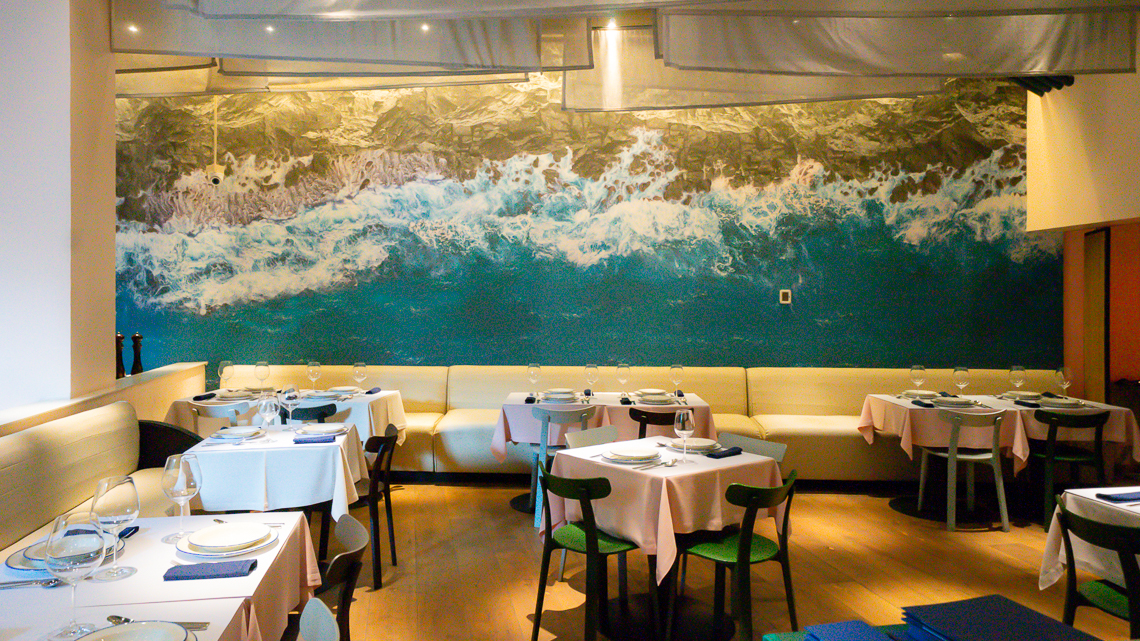 propuesta de mariscos y pescados que ofrecen y donde el mar es el protagonista, no solo en su comida, sino también en la decoración, con grandes murales donde el océano pareciera salir de algunas paredes y telas colgantes que asemejan el movimiento de la brisa marina.