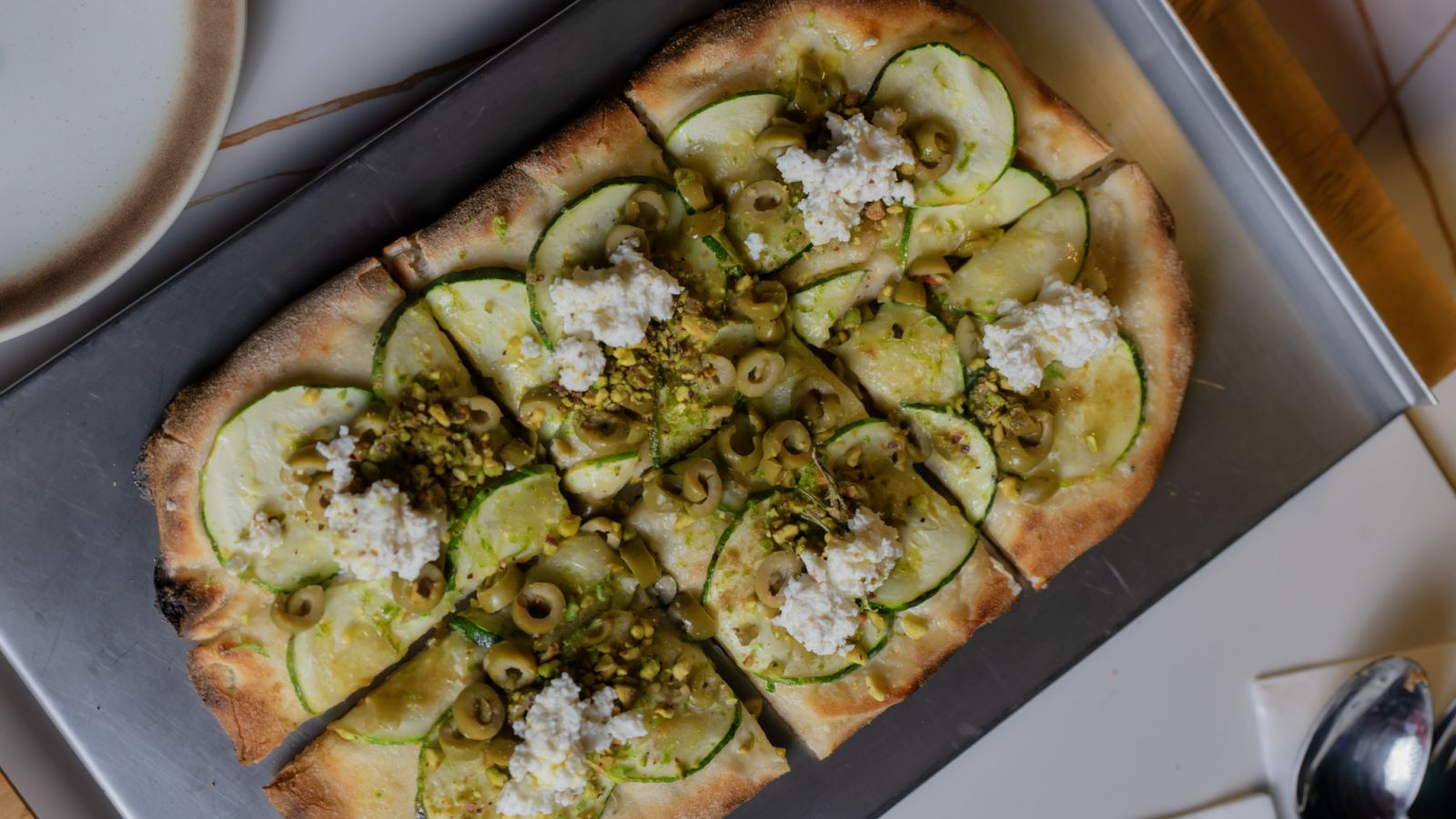 Otra de las opciones es la Pizza al Limón, con una base de crema trufada, rodajas de zucchini, pistacho molido, aceitunas sevillanas y un toque de zeste de limón que aporta un toque justo de acidez y frescura. Si de endulzar el momento se trata, el local recomienda el Flan Miso Caramelo, un postre fresco, sedoso al paladar y con la cuota justa de azúcar.
