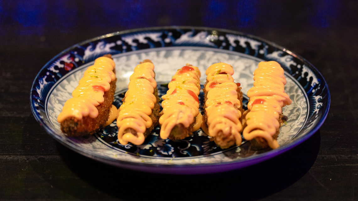 el Pollo Frito Coreano. Pechuga apanada frita con salsa picante, acompañada de mayo japonesa. Una preparación sabrosa y crujiente que bien vale la pena pedir, ya sea para compartir o de manera individual.