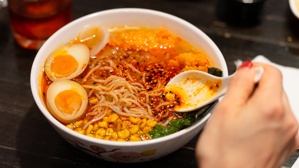 guiso japonés que se elabora en base a un caldo concentrado de huesos de cerdo y pollo durante 8 a 12 horas, más unos toppings con cebollín, choclo salteado con merkén, cebolla morada, nabo encurtido, huevo mollet marinado en soya y mirin, fideos del ramen, proteína que se puede elegir entre pollo crispy o chanchito frito y un toque de picante con aceite laiyu en base a semillas de sésamo y ají coreano. El resultado es una sopa algo cremosa con un sabor intenso y que sin duda disfrutarás en días gélidos.