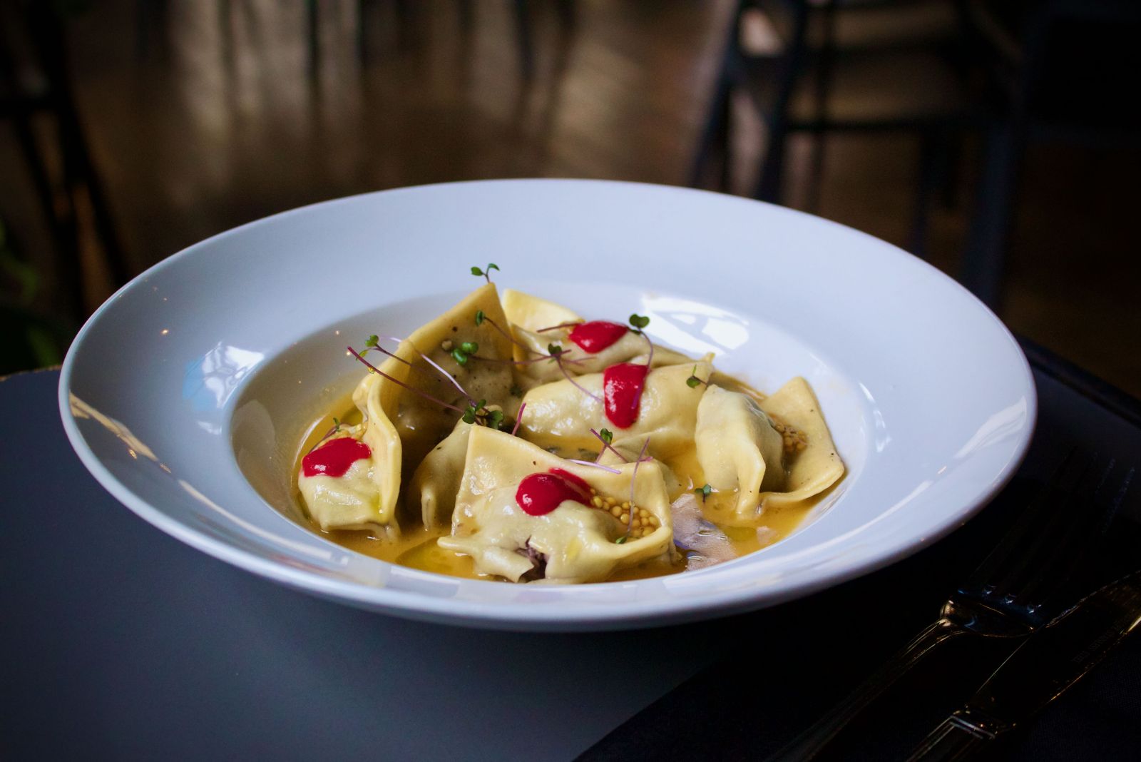 Pasta fresca elaborada en nuestro local, rellena de pulpo, aceituna mediterránea y nueces. Se acompaña de una salsa clásica beurre blanc con bisque de camarón, más una emulsión de betarraga asada y alcaparras que aportan frescura y contraste.