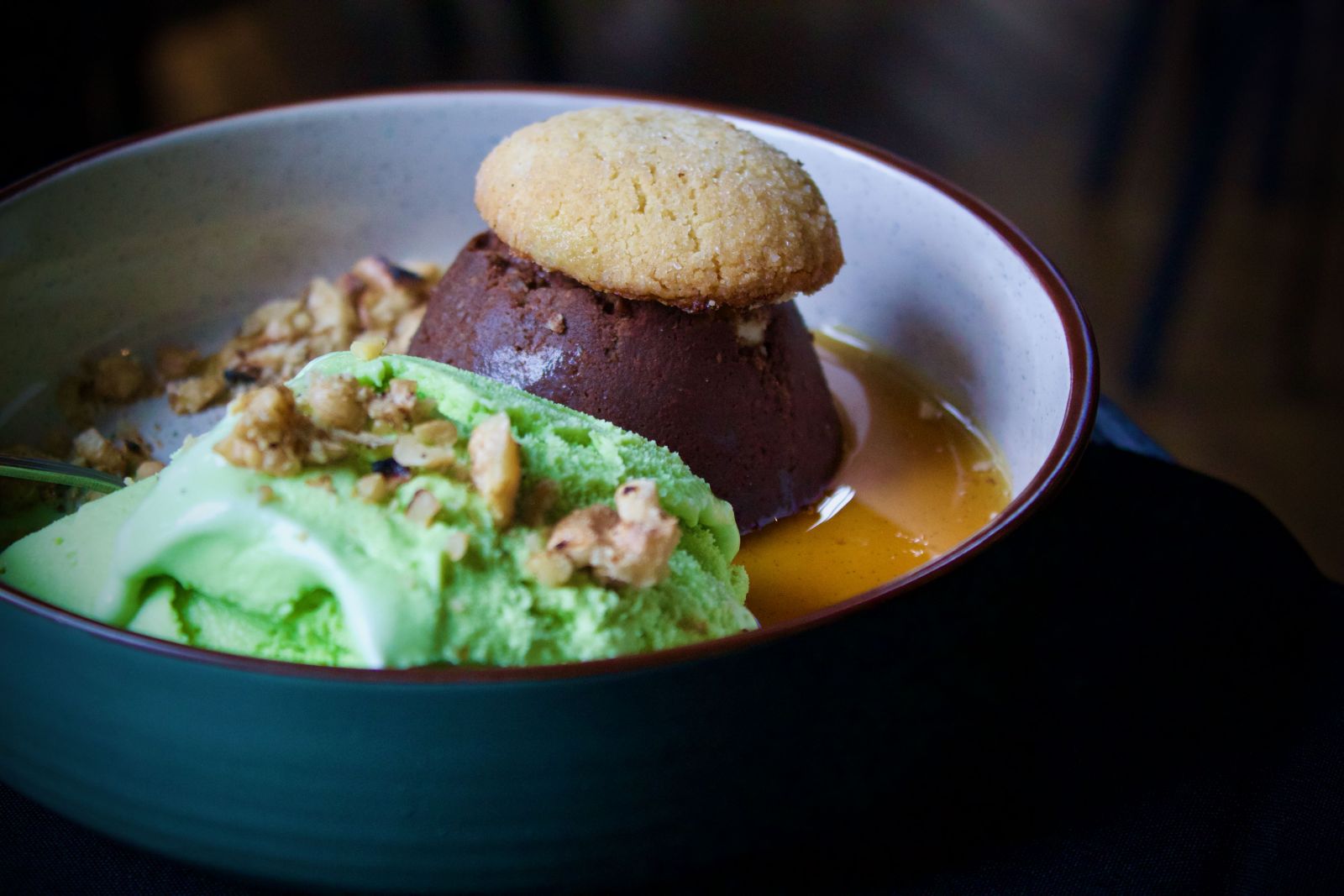 Postre típico del Piamonte, inspirado en las antiguas tradiciones italianas. Elaborado con cacao, huevos, leche y galletas de amaretto. En nuestra versión, lo servimos acompañado de un delicado helado de pistacho.