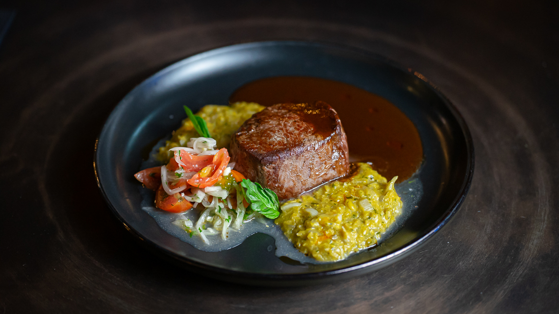 Filete con pastelera de choclo y ensaladilla de chilena, una elaboración clásica, con la esencia y el carácter de la cocina chilena, Otra opción es la Pasta Trufada con mantequilla de champiñones, straciatella y polvo de callampas.