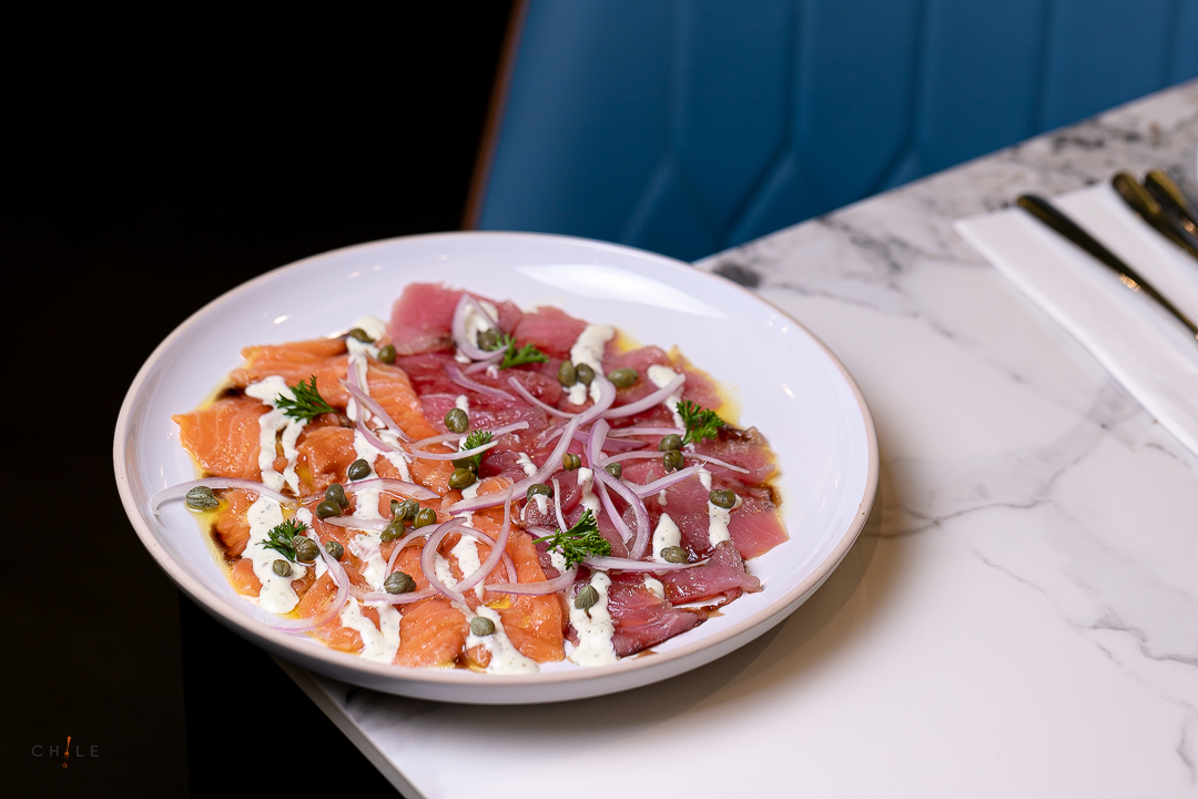 una trilogía de tiraditos de salmón y atún, servidos en finas láminas y bañados en leche de tigre. Cada uno sorprende con una personalidad distinta gracias a sus cremas de ají amarillo, rocoto y cilantro, que van del sabor suave al toque picante y fresco. Para acompañar, un