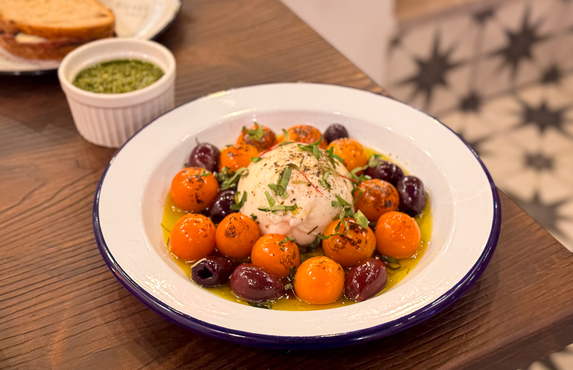 burrata, un plato simple, pero cuidadosamente elaborado. Queso cremoso, con tomates cherry asados y las aceitunas de azapa en oliva, que aportan ese toque salado y umami que lo hace tan especial. El pesto casero le da frescura al conjunto, haciendo de este plato una excelente opción para quienes disfrutan de los sabores mediterráneos.