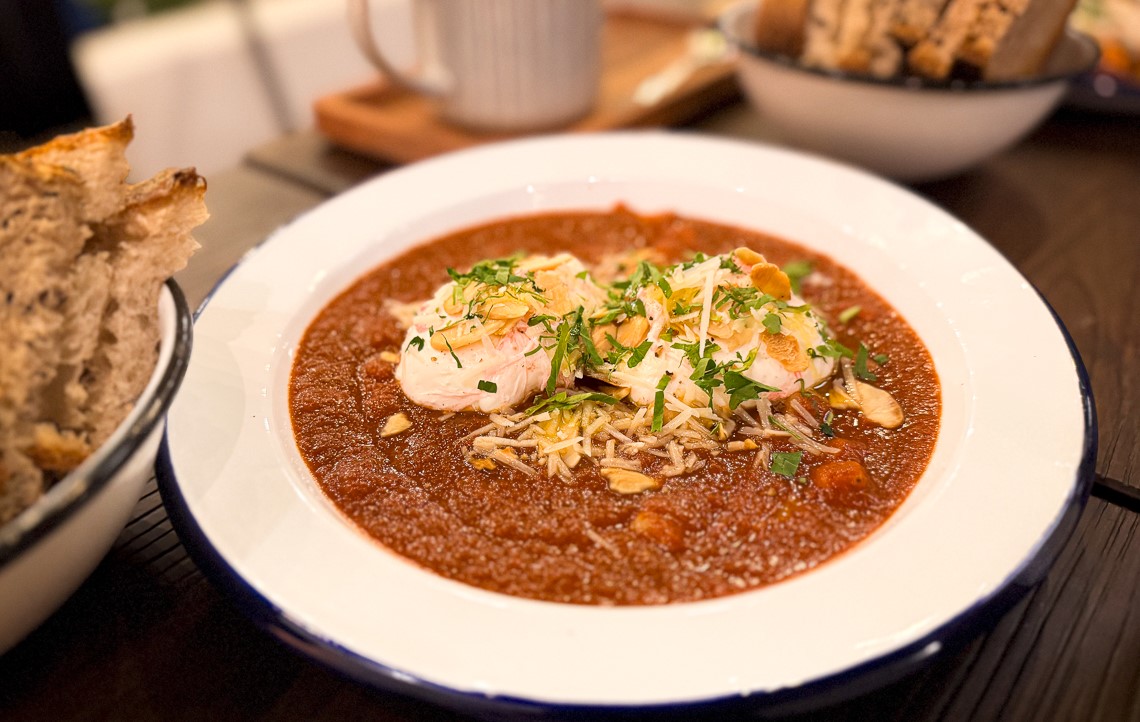 famoso shakshuka, un plato que ofrece un equilibrio perfecto entre lo ácido de la salsa pomodoro especiada y los matices terrosos de los condimentos de la India. Los huevos pochados coronan el plato, brindando una textura suave, mientras que el queso pecorino y las almendras laminadas aportan una capa adicional de sabor y crocancia.