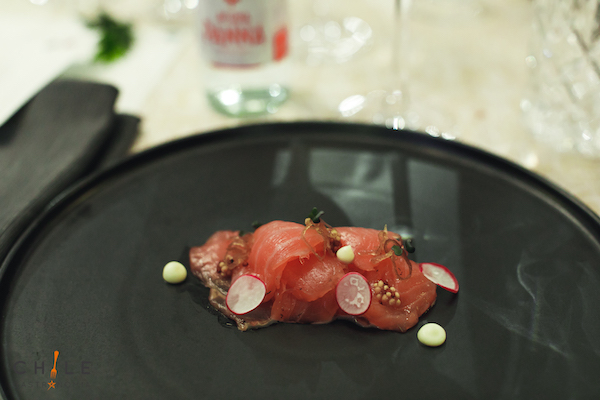 centolla de Juan Fernández, texturas de mango y limoneta de cilantro. La segunda estación fue un salmón marinado en casa, con pistilos de limón confitado,