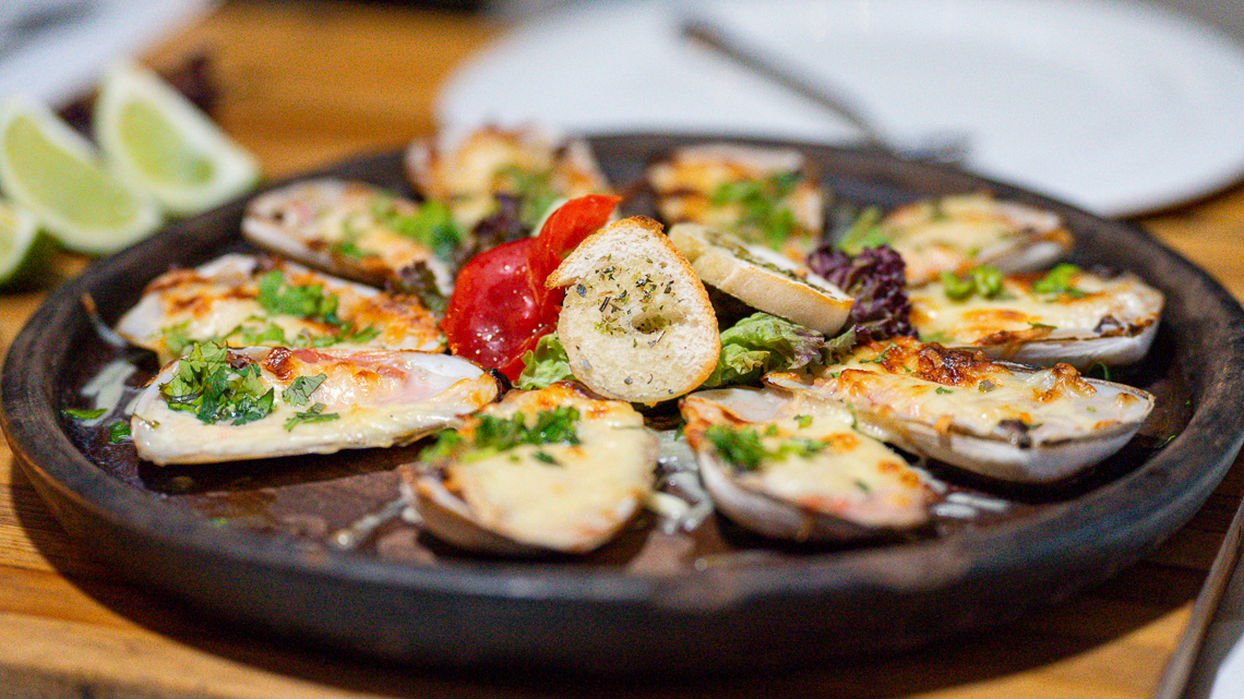 pisco sour frío y balanceado, que acompañamos con unas Machas a la Parmesana bien gratinadas con queso parmesano y unos Locos Frescos con papas cocidas, mayonesa y salsa verde. Cada una de estas propuestas resultó ser un entrante correcto en cocción, sabor, texturas y acompañamientos.