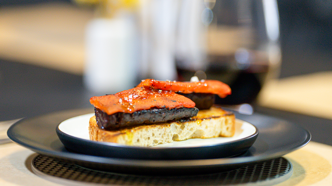 montadito de prieta y pimentón, un bocado mediterráneo en pan de masa madre sencillo, pero muy sabroso.