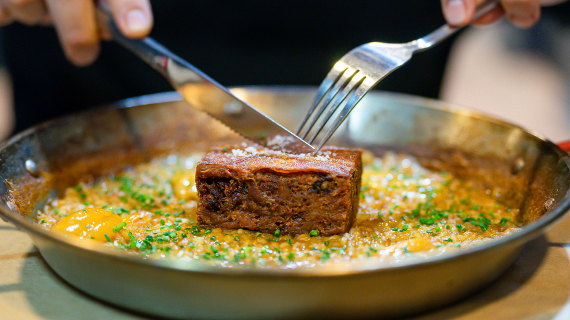arroz con lechón confitado. Un grano japónico importando directamente de Asia, redondo y firme, que demora 18 minutos lograr la cocción perfecta. ¿Resultado? Un platillo perfectamente ejecutado, con una proteína bien adobada y de sabor explosivo.
