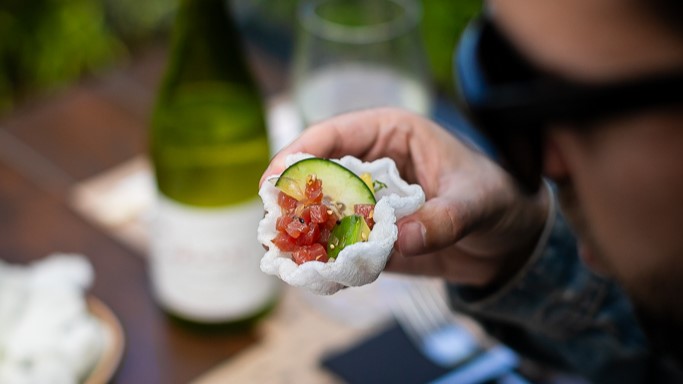 Sensei Roll, un favorito de los comensales que quedó en el top 3 de los mejores en la lista de Sushi and Gohan en 2022. Este roll fusiona la esencia caribeña con la asiática: relleno de kanikama crunch, queso crema, cebollín y plátano, cubierto con atún flameado y un toque de sweet chili y merquén, un condimento chileno que une los sabores de Chile, Asia y el Caribe en un solo bocado.