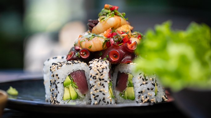 Coctelito Roll, una creación inspirada en las costas de Cumaná, tierra natal del chef García. Esta exquisita combinación de atún, palta y cebollín se complementa con un topping de calamar, pulpo y camarón, en homenaje a los sabores caribeños de Venezuela.