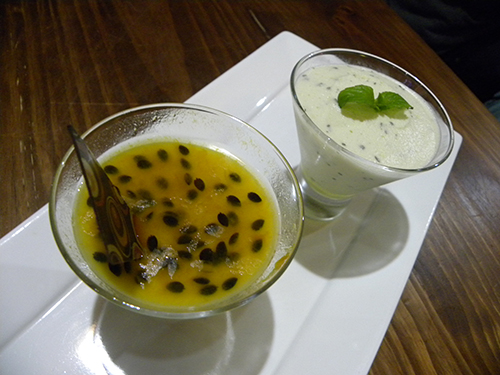 Luego de disfrutar una muy buena mezcla de sabores, y muy refrescantes para ser sándwich, Camila nos sorprendió con los postres Panacota de Mango con salsa de Maracuyá y toques de chocolate, más un Mousse de menta, limón y jengibre, demostrando que en Rústico Sanguchería no sólo preparan ricos churrascos y hamburguesas, sino que también se puede disfrutar de muy deliciosos postres y jugos naturales, para endulzar tan apetitoso momento.