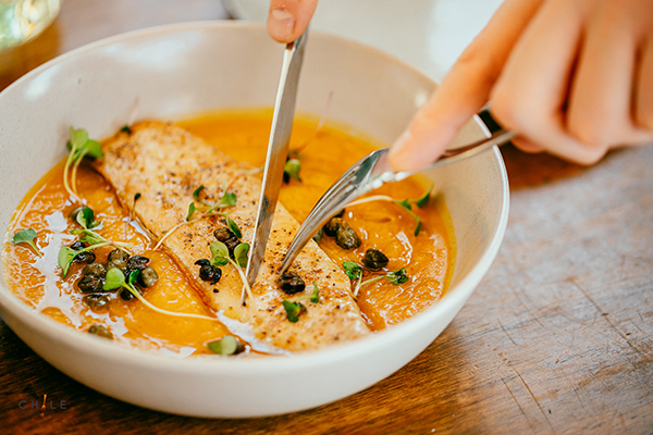 Si lo suyo es la delicia marina, el menú del Guappo tiene entre sus fuertes la pesca del día: el turno fue de la reineta a la mantequilla con puré de zapallo, brotes y alcaparras. Pesca fresca y artesanal a la mesa. Recomendamos para acompañar el sensacional Chardonnay de la viña Calyptra del Valle del Cachapoal.
