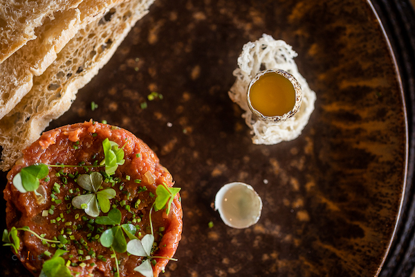 Tártaro de Filete que es molido al momento, aliñado con especias y es servido en tostadas con un huevo de codorniz trufado y luego, para abrigar el cuerpo, probamos el