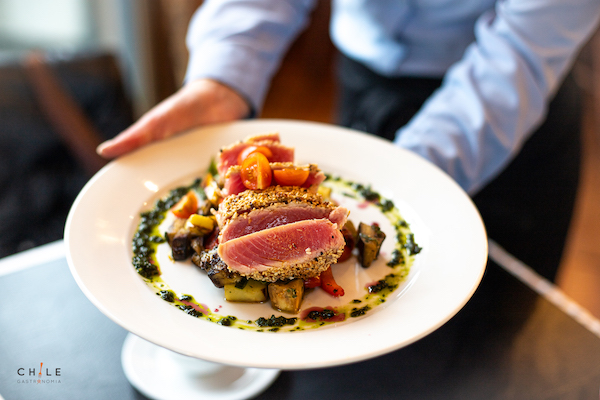 Atún en Costa de Sésamo en un punto correcto, con pesto de rúcula y verduras salteadas y también, un imperdible del sur,
