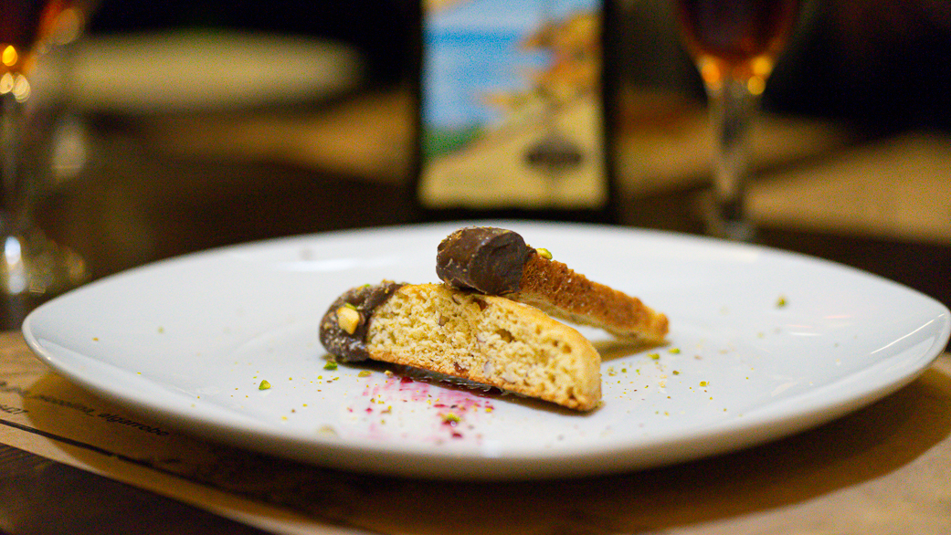 Quinto tiempo: cantucci de nuestra producción al chocolate y pistacho maridaje licor amaro del capo de gourmitalia.