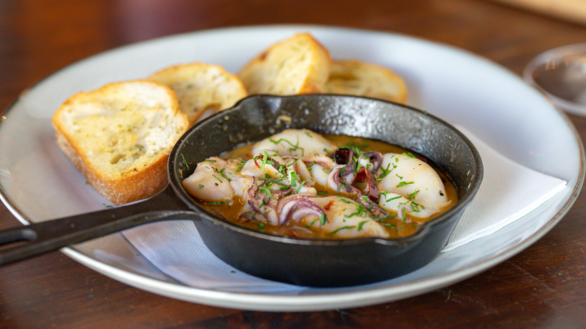 Chipirones, calamares de un tamaño pequeño al ajillo en sartén de hierro con ají cacho de cabra y tostadas. Una elaboración que brilla con un producto delicado y enjundioso. Idealmente debes untar el pancito en el jugo que está en el librillo para terminar la experiencia como corresponde.