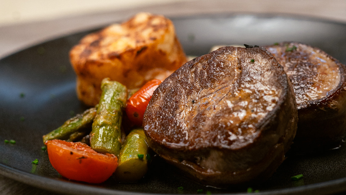 Lomo de res a la parrilla, jugoso y lleno de sabor, acompañado de gratín de papas y salsa de champiñón.