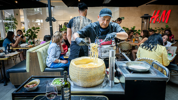 Pero, el protagonista de Pomeriggio Bistró es sin duda la Pasta a la Rueda, que consiste en fetuccini de la casa preparados por
