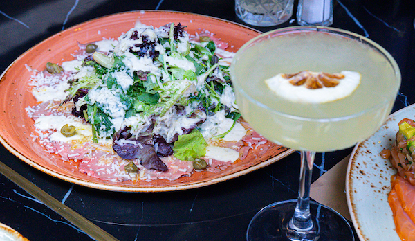 carpaccio de lomo de res acompañado de salsa de atún, crunch de alcaparras, mix de verdes y queso grana padano.