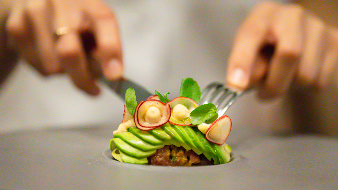 Falso Nigiri de Tartar de Atún, marinado en soya, jengibre y jugo de limón, cubierto con finas láminas de palta, mayonesa de chorizo ahumado y un crocante de mote que aportó la crocancia justa y necesaria. En esta oportunidad, los cocineros quisieron darle una forma de nigiri, para presentar algo simple, pero elegante y atractivo.