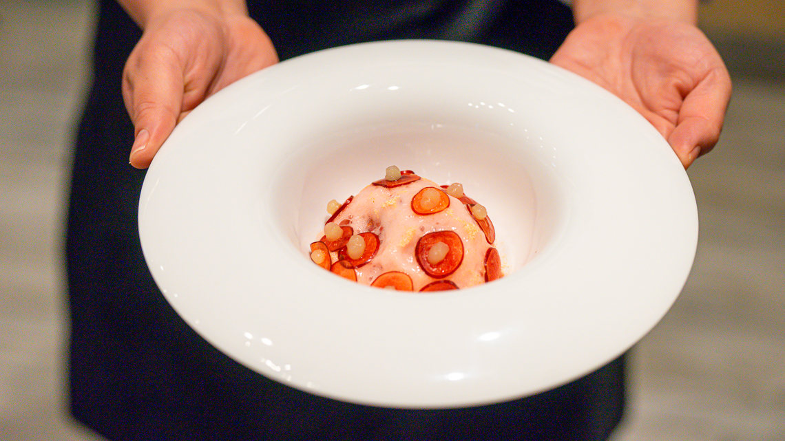 Tartar de Frutas de la estación con frambuesas, moras, manzana verde, un pequeño toque de limón sutil y una espuma de sandía con harina tostada. Una invención exquisita desde su génesis y técnica depurada, que en definitiva transporta a esas tardes de domingo y verano en familia.
