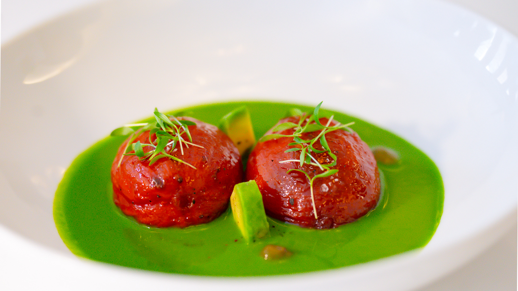 Tomates caramelizados rellenos de bonito ahumado en casa, alcaparras y una crema fría de palta y cilantro. Una elaboración cuidada desde sus inicios, ya que cada paso está pensado para lograr un balance atractivo visualmente y rico al paladar. Otra de las opciones puede ser la