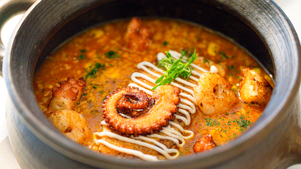 Arroz caldoso de mariscos con merluza austral confitada, sin embargo, en esta oportunidad la degustamos con una albacora que, a decir verdad, nos dejó embelesados por su gustillo a mar gracias a los trocitos de pulpo y camarones.