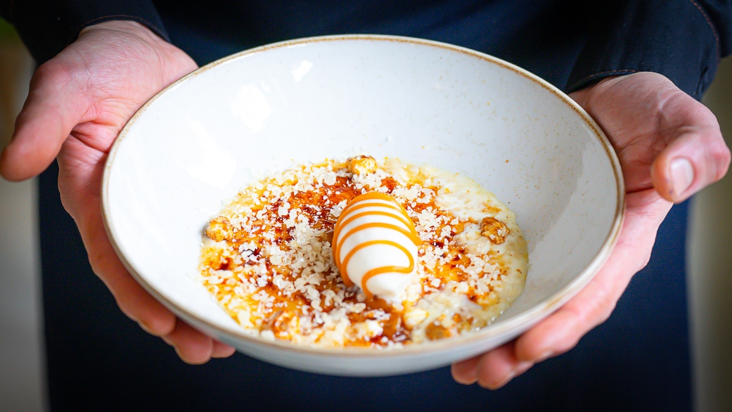 Arroz con leche, toffee, nueces caramelizadas, helado y petas zetas.