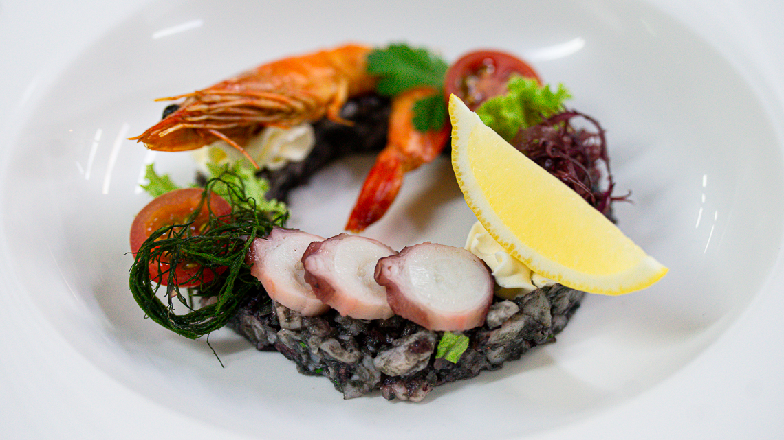 Pulpo (Sea Garden) con Pasta de Aceitunas Negras y Camarón (Sea Garden) especiado. Una preparación visualmente atractiva y de sabores intensos, pero no podemos dejar de nombrar también su delicioso