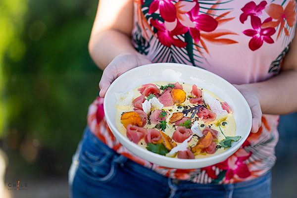 Semillón de Maturana Wines, con notas de frutas silvestres, cáscara de cítricos, rosas y bergamota el cual maridamos con un sabroso y muy bien logrado Camembert al fierro con toques de trufa, hierbas frescas y salsa de frutos rojos.
