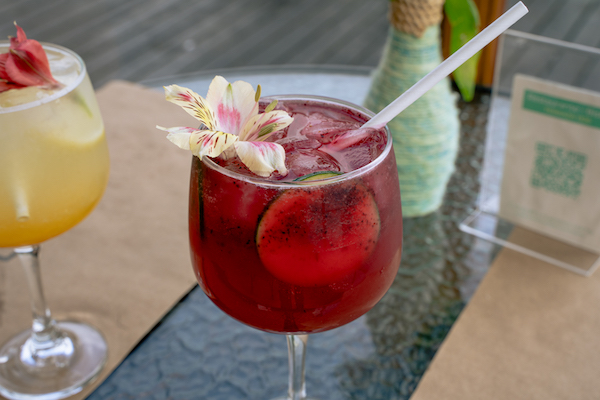 coctelería de autor llamado Gin keny y Tropical eva, exquisitas preparaciones dulces con flores comestibles.