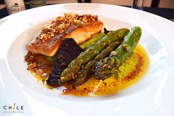 frutos secos, acompañado de puré de arvejas-beterraga y espárragos confitados con una salsa de emulsión de
