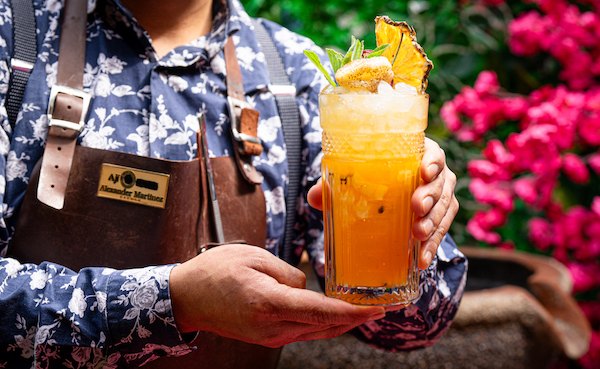 en base a pisco, jugo de maracuyá, trozos de piña, jarabe de lima ahumado y agua tónica amazónica peruana donde predomina la Pitahaya, un fruto típico del país y el Camu Camu, una planta silvestre.