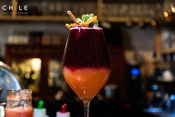 Montecarmelo, Reducción naranja y zanahoria, Ron havana 7 años, Jugo de limón, Syrup, Top Espumante Undurraga Brut y Rosé.