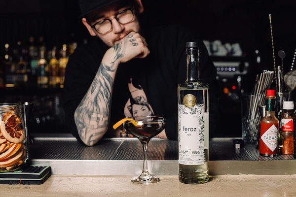 Gin Feroz, como por ejemplo una reversión del Blood & Sand x Margarita con gin, jugo de pomelo,