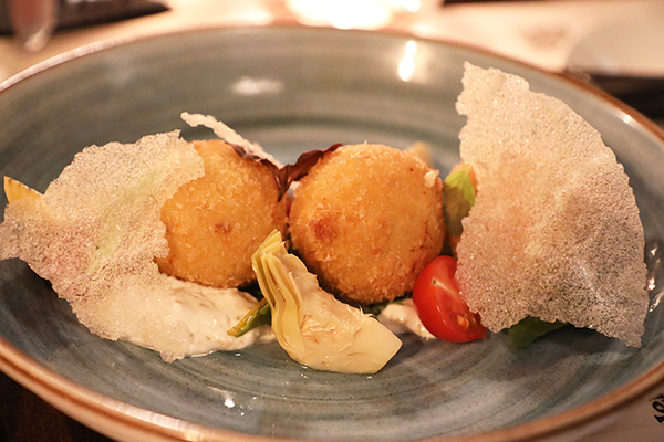 Bombón relleno de toffe salado y canoli siciliano.