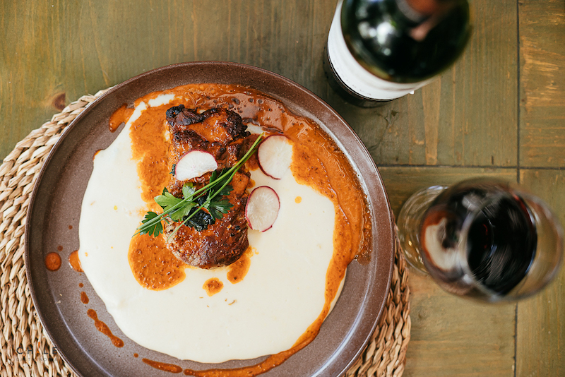 Filete a la Alameda bañado en salsa anticuchera, acompañado de un original puré de choclo peruano que le entrega una especie de dulzor que se agradece, además de un