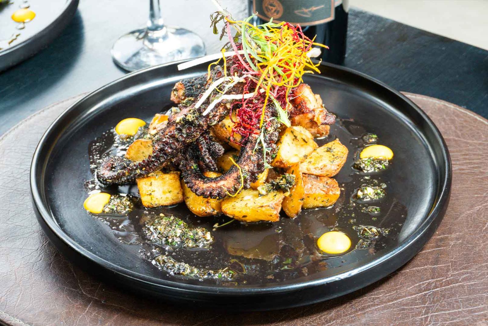 bañado en una deliciosa salsa de mostaza antigua y miel; lomo saltado, congrio en espuma sour, acompañado con camarones y calamares a la parrilla, perfumado con una suave espuma y un sabroso arroz mojado de mariscos; pulpo a la parrilla marinados con finas hierbas y servidos con fetuccini; timbal de camarones ecuatorianos sobre fetuccini.